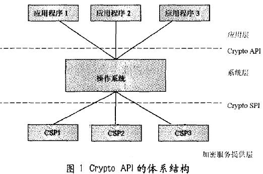 2.1智能卡與PC/SC規(guī)范 智能卡是一張內(nèi)含嵌入式集成電路芯片的信用卡般大小的塑料卡,具有儲存信息量大,數(shù)據(jù)保密性好,抗干擾能力強,儲存可靠,讀寫設(shè)備簡單,使用靈活,操作速度快,脫機工作能力強,易于攜帶等特點。本系統(tǒng)所使用的智能卡是一張?zhí)刂频膬?nèi)含有交換密鑰對,簽名密鑰對和證書用以提供加解密、認(rèn)證等服務(wù)的電子卡。 PC/SC規(guī)范是一套為集成電路卡(ICC)與個人計算機系統(tǒng)設(shè)計進(jìn)行交互的規(guī)范,能夠讓智能卡方便地訪問WindoW平臺。其主要優(yōu)點就是讓應(yīng)用程序不必為了與智能卡通信而去了解智能卡讀卡器的細(xì)節(jié),應(yīng)用程序通過PC/SC規(guī)范和智能卡讀卡器通信,后者再通過ISO7816與智能卡進(jìn)行通信來獲取智能卡提供的服務(wù),其傳輸?shù)陌Y(jié)構(gòu)是TPDU。 1.2 Crypto API體系結(jié)構(gòu)與CSP Crypto API是微軟提供的一套公共接口,包含了一系列的函數(shù),為應(yīng)用程序提供加解密、數(shù)字簽名、哈希等安全服務(wù),而應(yīng)用程序不必關(guān)心其具體實現(xiàn)。不同的供應(yīng)商可以開發(fā)獨立的加密模塊,這些模塊成為加密服務(wù)提供者(Cryptographic Service Provider CSP),完成密鑰生成/交換、加解密、數(shù)字簽名、認(rèn)證等服務(wù)的真正模塊。微軟默認(rèn)的CSP是RSA Based Provider,使用RSA公司的加密算法。一個系統(tǒng)中可以加載多個CSP模塊,它們相互獨立。應(yīng)用程序可以使用任意一個CSP模塊,而不必關(guān)心它的具體實現(xiàn),每個CSP都對Crypto API進(jìn)行不同的實現(xiàn)。 Crypto API的體系結(jié)構(gòu)如圖1所示。